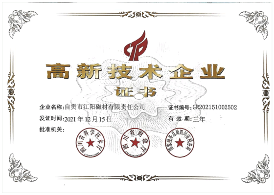 2020年12月18日自贡市人民政府新闻办公室、自贡市质量强市工作领导小组办公室、自贡市市场监督管理局联合举行自贡市第三届政府质量奖暨2020年质量工作新闻发布会,市政府新闻办主任杨斌主持发布会,江阳磁材荣获“自贡市第三届政府质量奖”。由自贡各部门共同推举、市质量强市办审定,并由人民群众广泛参与的网络投票产生了2019-2020年围绕“质量奖”各行业部门特色亮点质量工作,自贡市质量强市工作领导小组副组长、自贡市市场监管局局长余忠介绍了自贡市政府质量奖总体情况,发布了“自贡市第三届政府质量奖”评定结果,自贡硬质合金有限